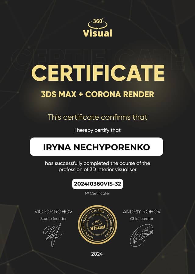 Я спеціалізуюся на створенні фотореалістичних 3D-візуалізацій інтер’єрів у програмі 3ds Max + Corona Render. Працюю з житловими та комерційними просторами, відповідально ставлюсь до кожного проекту, уважна до деталей і завжди дотримуюсь дедлайнів. Шукаю можливість приєднатися до команди професійних дизайнерів.
