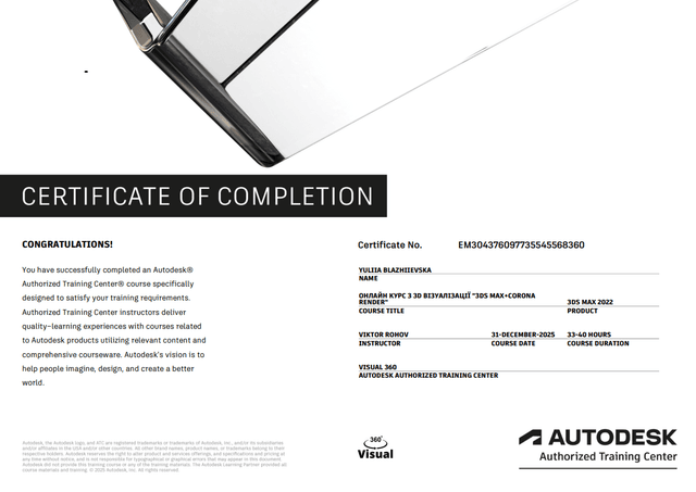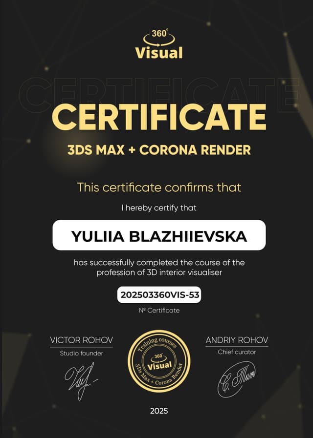 Вітаю, я 3д-візуалізатор дизайн інтер’єру.У цій сфері уже 2 роки.Працюю віддалено по всьому світу. Час роботи 1 невеличка кімната 2-3дні. Я прагну не просто виконувати завдання, а й привносити у проєкти креативне бачення та технічну досконалість. Моя мета- стати цінним, довгостроковим членом команди та сприяти досягненню найкращих стандартів у 3д- візуалізації. Я готова навчатися новому та швидко інтегруватися у ваші робочі процеси. Навички:3d Max; Autodesk; Corona Rendering; Adobe Photoshop.